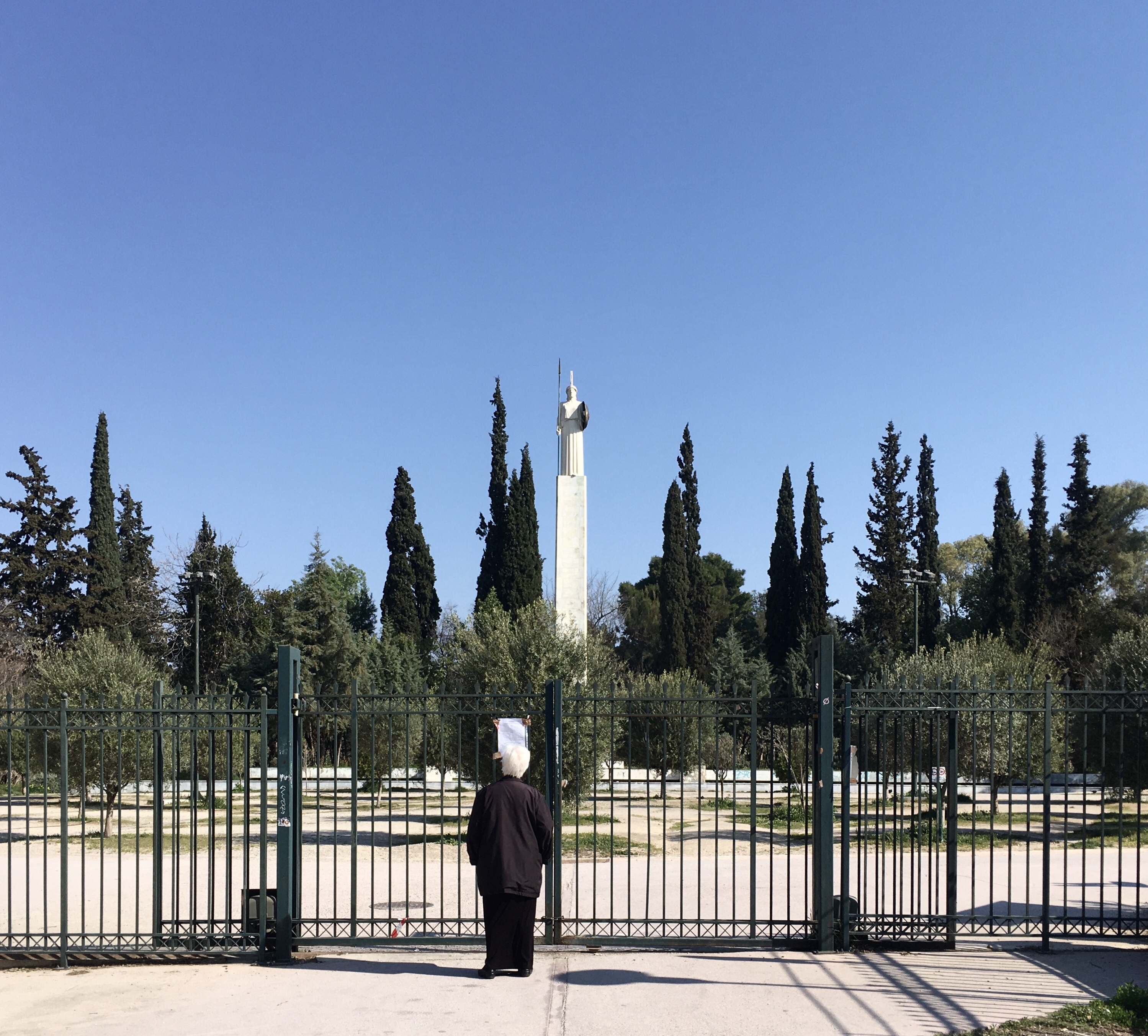 Parkın kapalı kapıları ardında yaşlı bir kadın ve şehrin koruyucusu güzel Athina… …